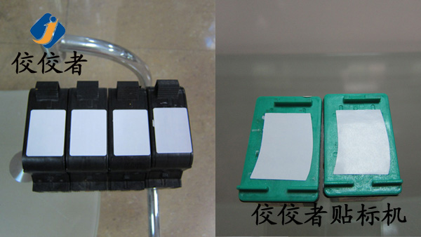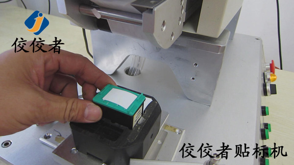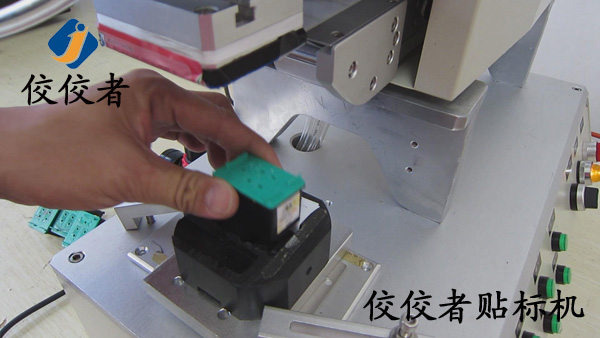 如圖展示的是工作人員將需要貼標的小墨盒放在治具(固定產品用的模具,可根據產品的不同形狀定做).