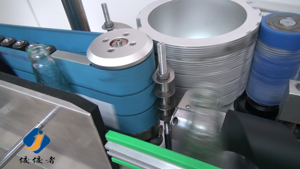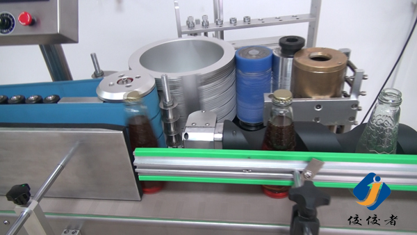 看到上圖中玻璃瓶子后面有一條螺旋狀黑色柱體了嗎?那個(gè)圓柱體就把瓶子們的間距調(diào)節(jié)得與出標(biāo)頻率吻合,瓶子們被一個(gè)個(gè)送到下圖這個(gè)傳送帶上進(jìn)行貼標(biāo),傳送帶會(huì)準(zhǔn)確地把已經(jīng)糊好漿糊的標(biāo)簽給貼上瓶子,如下圖: