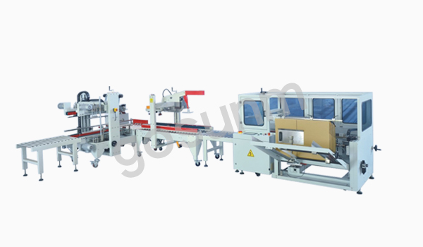 組合包裝線B,型號為 GSZ-KFJ-001XZ,本包裝流水線主要操作流程:自動開箱→手動裝箱→自動一字型封箱→自動封紙箱四邊角→包裝完成