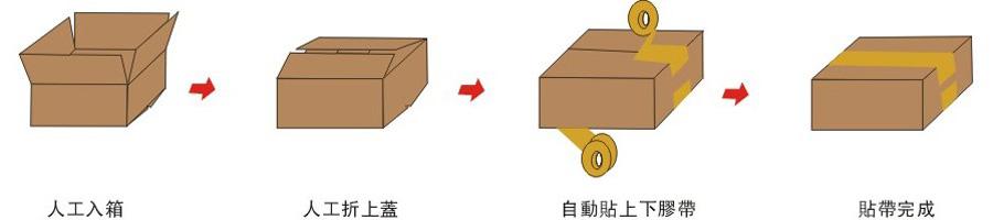 ◆ 本系列是以單機機型上下“一”字型貼膠帶,多規格化全自動封箱包裝作業